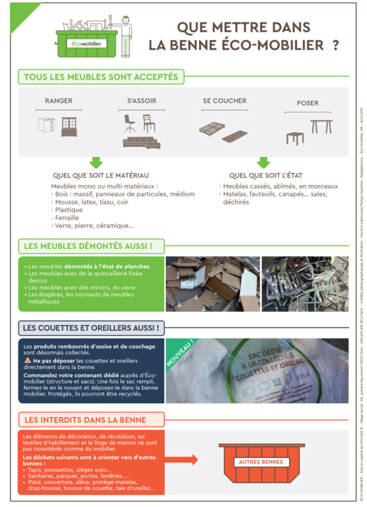 Le dépôt de déchets d’ameublement et de mobilier (DEA) est gratuit pour les particuliers ainsi que pour les professionnels sur présentation de la carte ECOMAISON (anciennement ECOMOBILIER) en cours de validité.